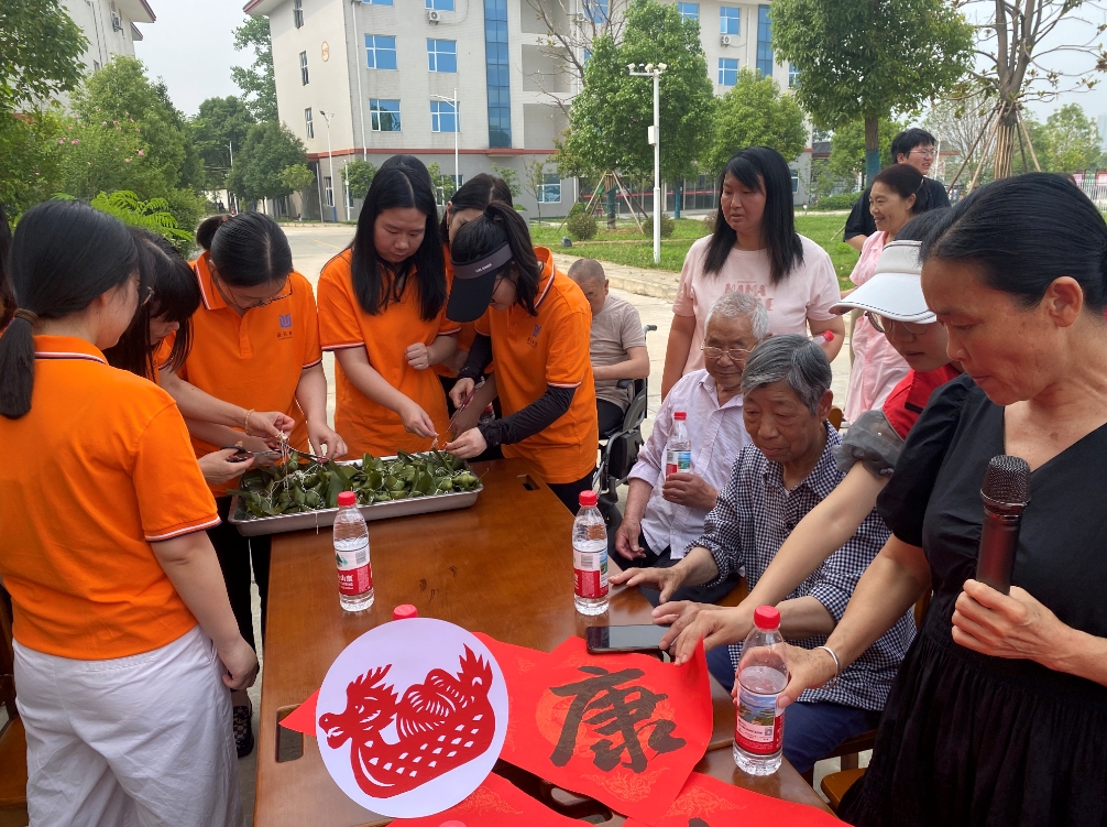 5月28日上午,在端午佳节来临之际,hg8088皇冠组织30余名志愿者前往钟祥市社会福利院松鹤园养老服务中心,开展“粽香敬老·非遗传福”主题公益活动。通过包粽子、写福字、剪窗花、赠香囊等传统民俗体验,为老人们送上节日关怀。