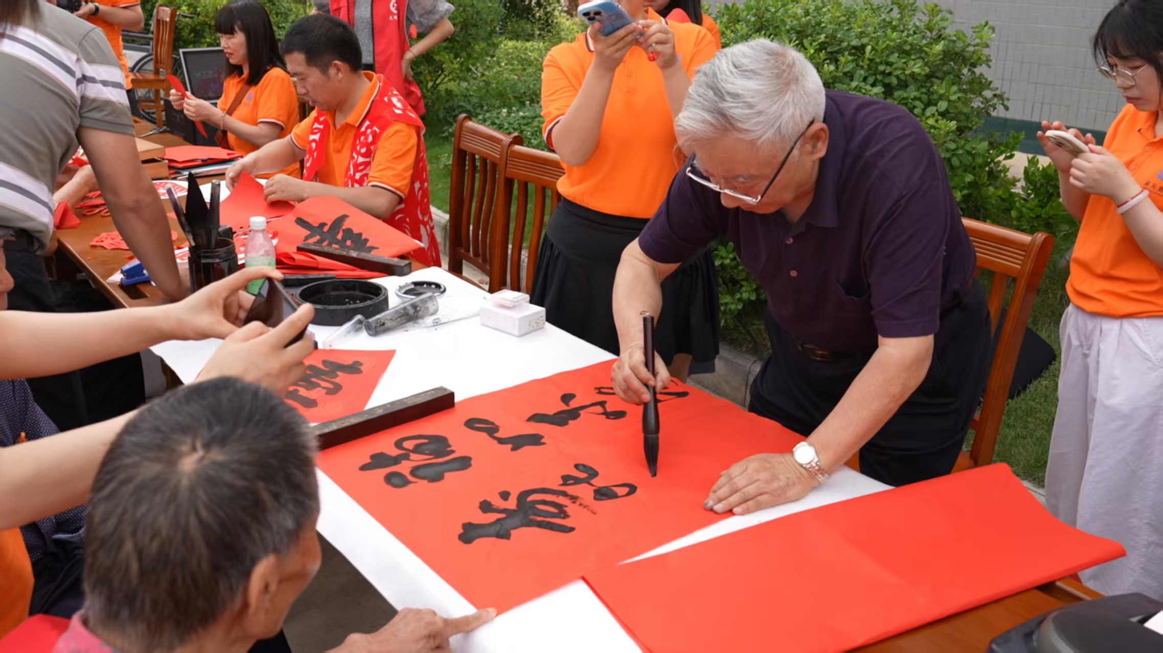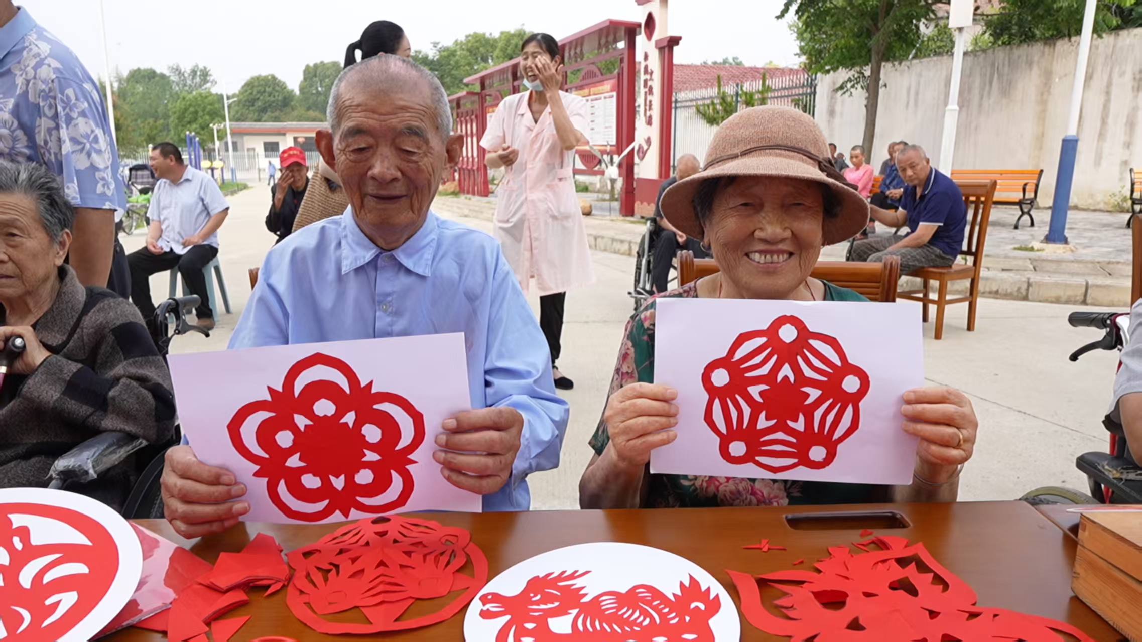 书法区墨香四溢,现年82岁的著名书法家兼学者刘大文教授作为志愿者,欣然为福利院的老人们挥毫泼墨,在洒金红纸上书写一个个“福”“寿”大字,笔锋苍劲有力;剪纸区则在钟祥剪纸非遗传承人江小鱼的现场指导诞生了“龙舟竞渡”“端午祛五毒”“吉祥团花”等主题窗花,非遗技艺在指尖熠熠生辉。